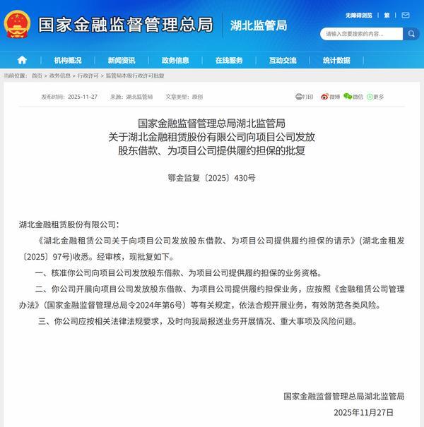 中国网财经12月10日讯日前升鸿网升鸿网,国家金融监督管理总局湖北监管局公布相关批复,核准湖北金融租赁股份有限公司(简称“湖北金租”)向项目公司发放股东借款、为项目公司提供履约担保的业务资格。
